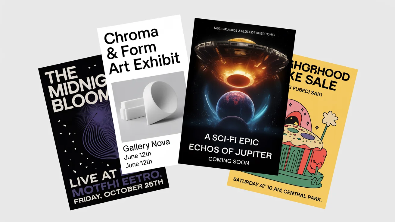 You can create a wide variety of posters for almost any purpose. This includes posters for events, concerts, movies, business promotions, sales, educational content, personal projects, and much more. Your imagination is the main guide.